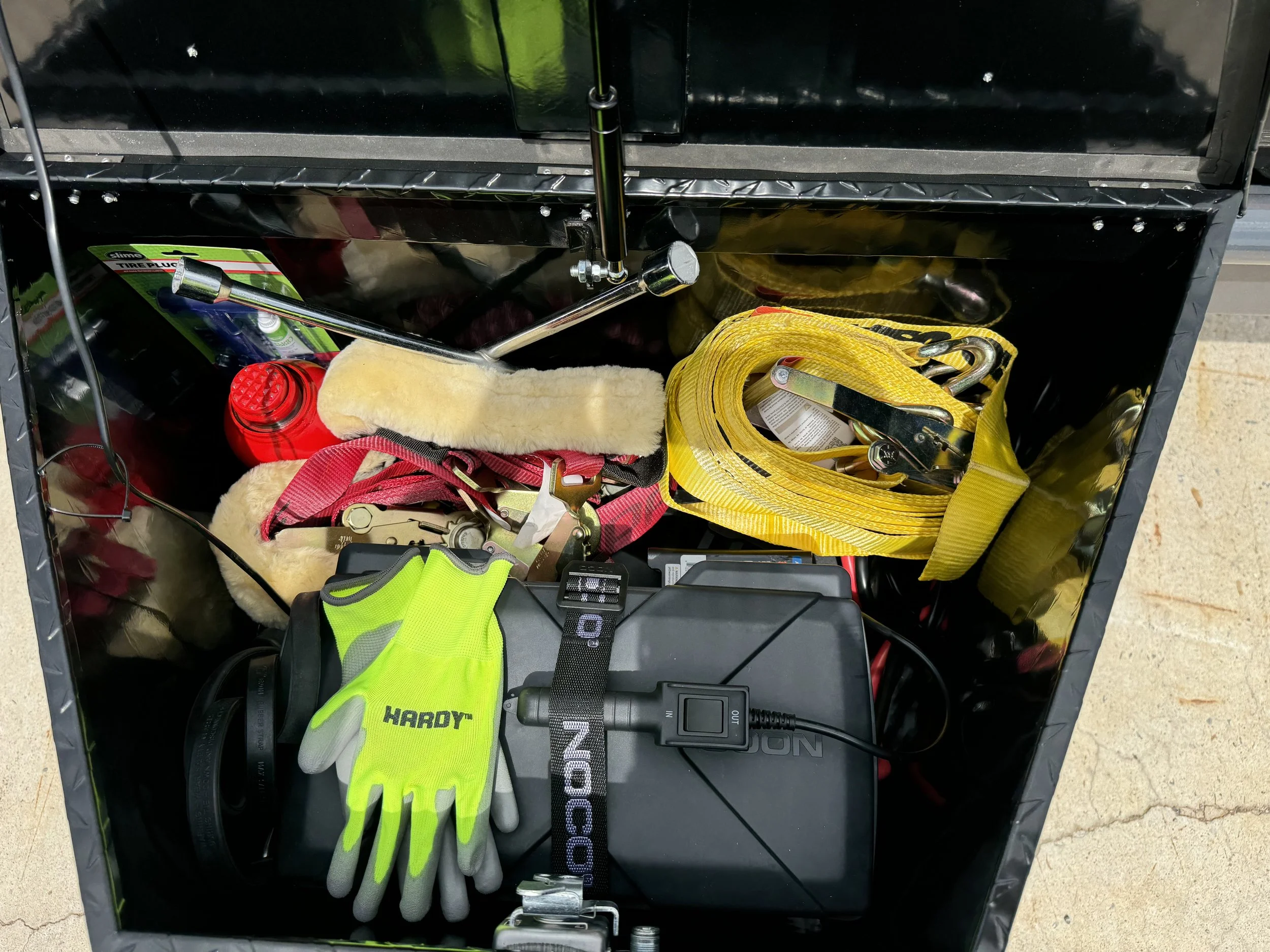 Comes with: Adjustable hitch, Ratchet straps, wood blocks, bottle jack, wheel/ axle straps, and more!